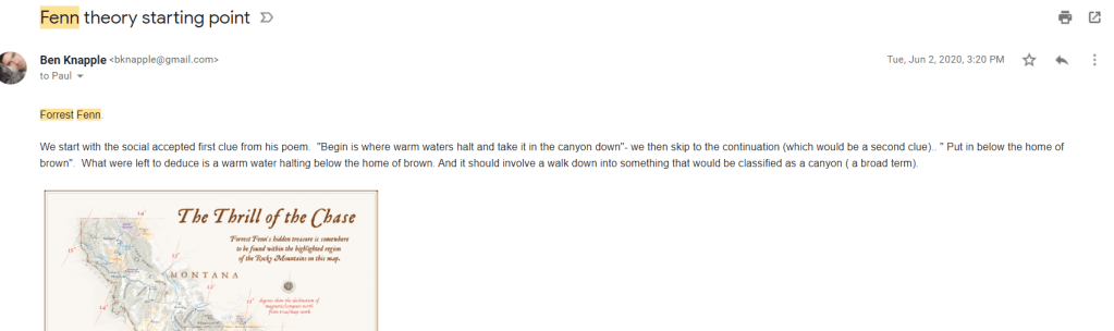 Except one problem happened…. It was June 5th, 2020. And rumors were flying that the chest was found. I can recall Paul swinging his head towards me as we coasted up into the Rockies “Get the fuck outta here bro, didn’t you just email Fenn like 3 days ago?” Indeed I had.